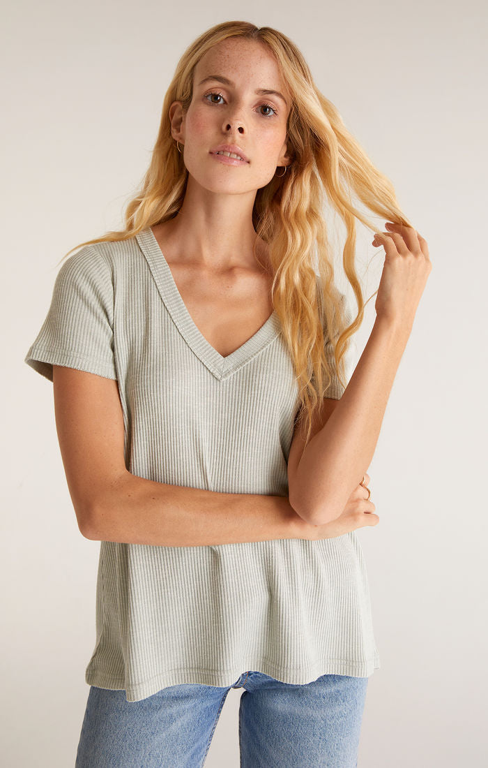 Back for Summer '22, the Dana Rib Hacci Top is made of our 2x2 Rib Hacci fabric, which is softly textured with a hint of stretch. This v-neckline top has a flowy, relaxed fit, high/low hemline and raw edge detail. The perfect match for denim. Fabric Content: 54% Rayon 43% Polyester 3% Spandex.