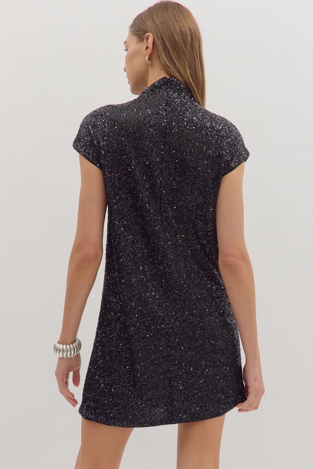 The Twilight Dress is a refined mini dress crafted from lightweight knit fabric, fully lined to ensure comfort and opacity. Its high neckline and short sleeves add modern elegance, while the dazzling sequins create a captivating finish. A discreet back zipper allows for easy wear. Perfect for evenings when you want to make a sophisticated, sparkling impression.