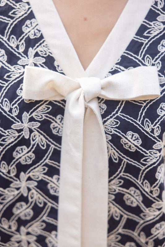 The Bow Tie Dress features a sophisticated V neckline complemented by a contrasting neck band and placket, enhancing its tailored silhouette. Elegant ribbon and button details add subtle texture, while the center back invisible zipper ensures a seamless fit. Crafted from embroidered woven fabric, this dress combines refined craftsmanship with distinctive design elements for a polished and expert finish.